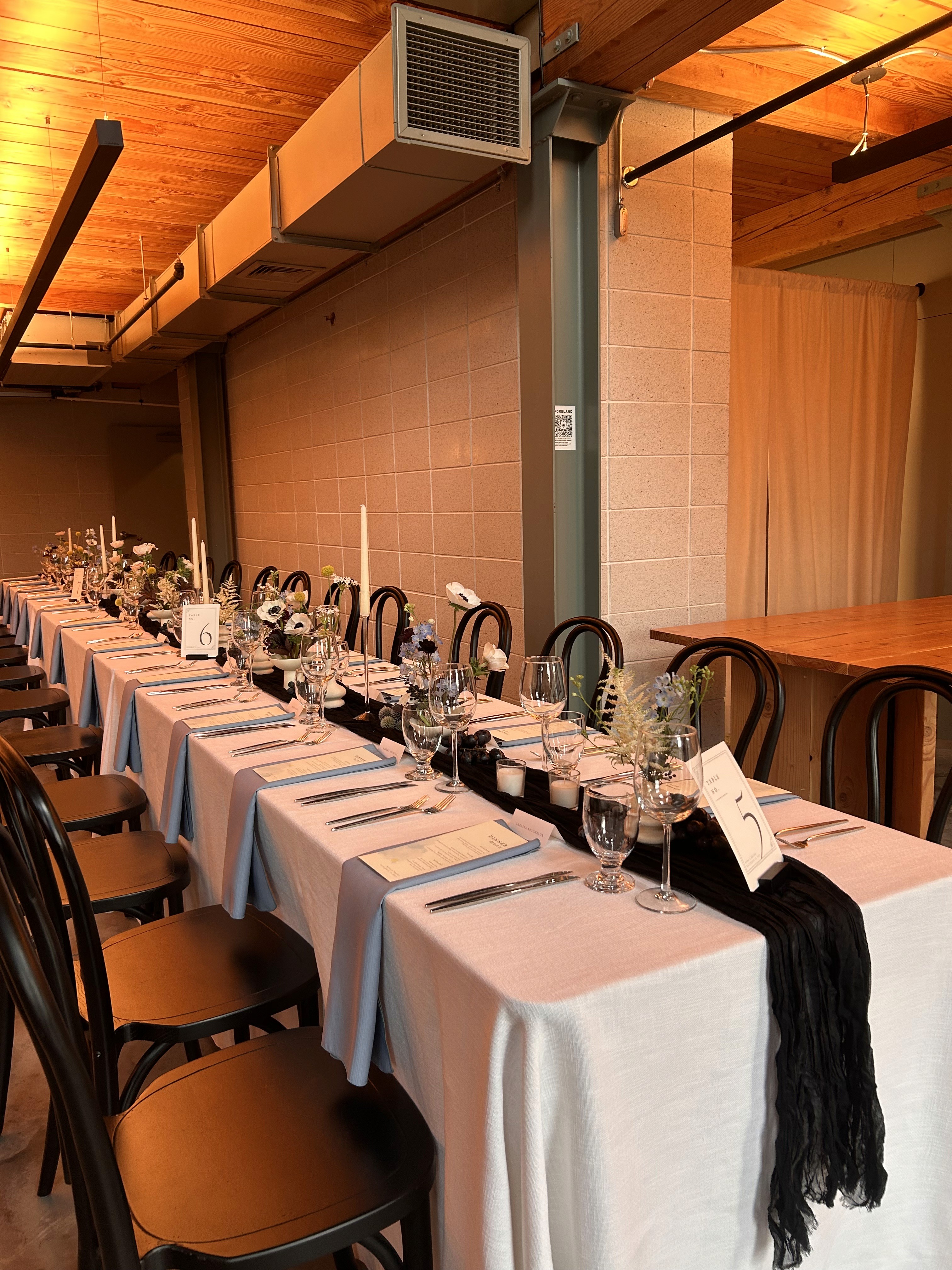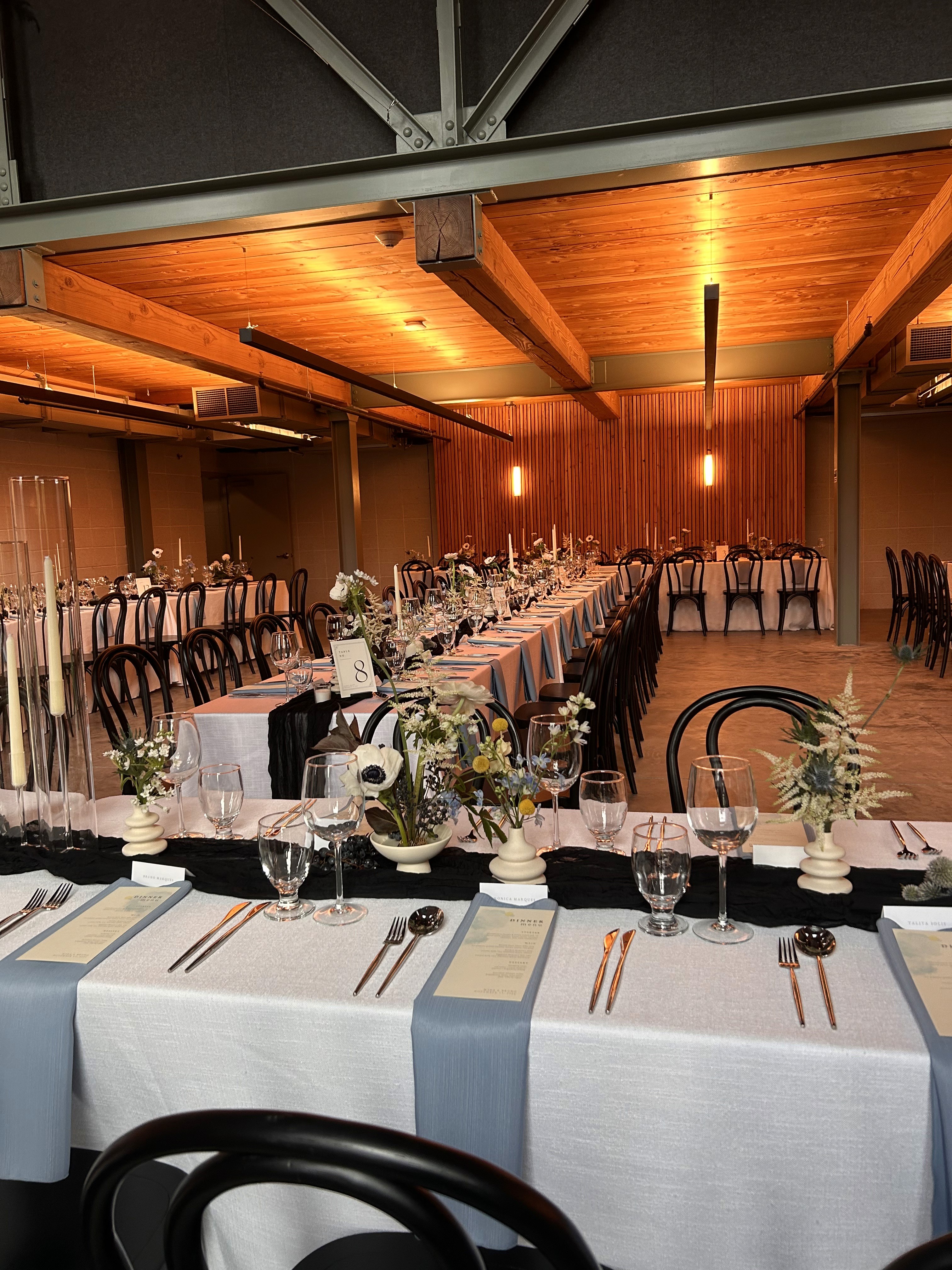 The centerpiece of the project was a large‑scale suspended cloud of baby's breath, mounted above the center table using wire drilled into the venue's brick structure. Despite being made entirely of light, delicate material, the sheer volume and density of the cloud gave it a dramatic, almost heavy presence. That tension between lightness and scale became the defining quality of the piece, hovering between weightlessness and gravity, softness and command.