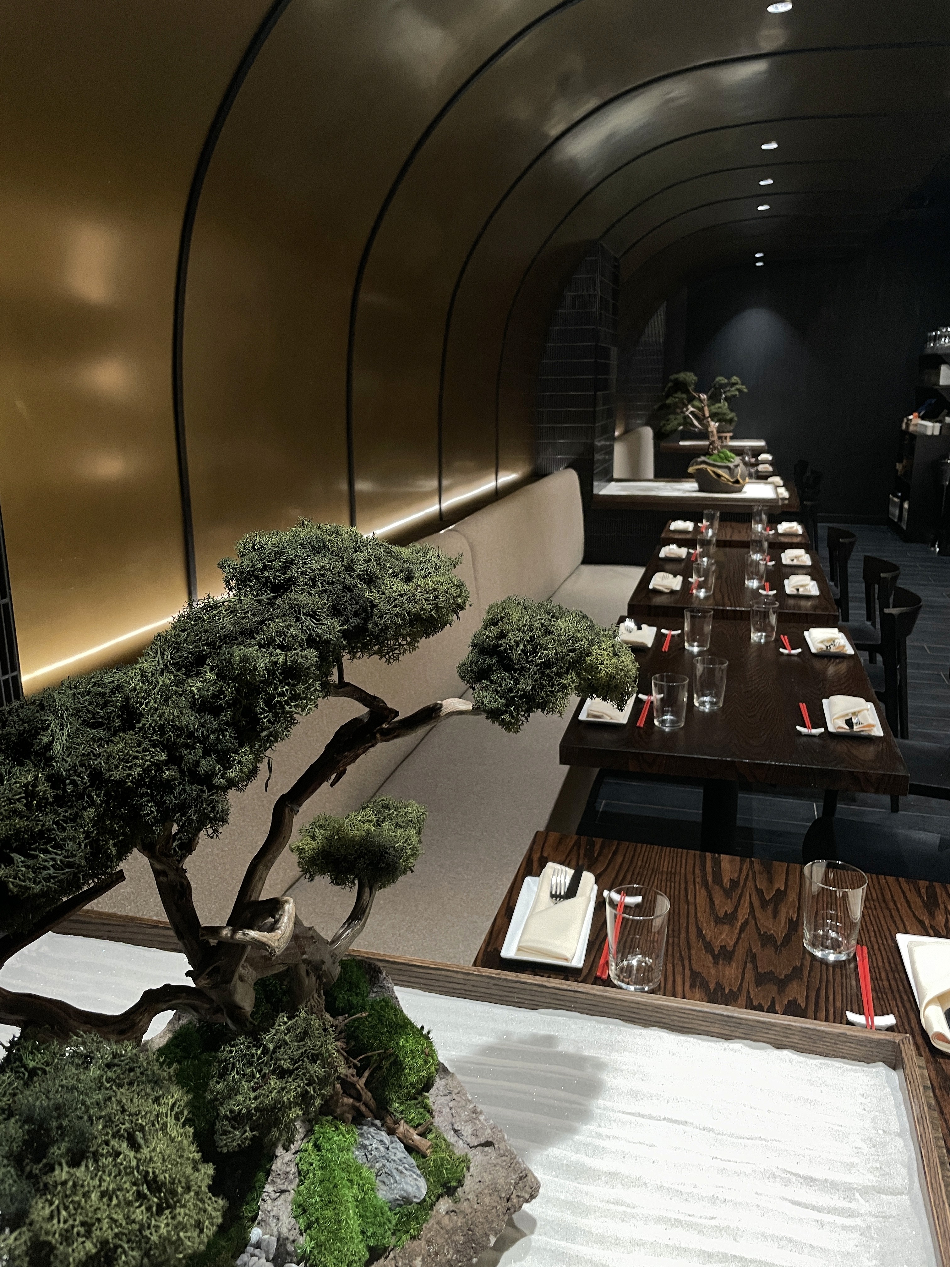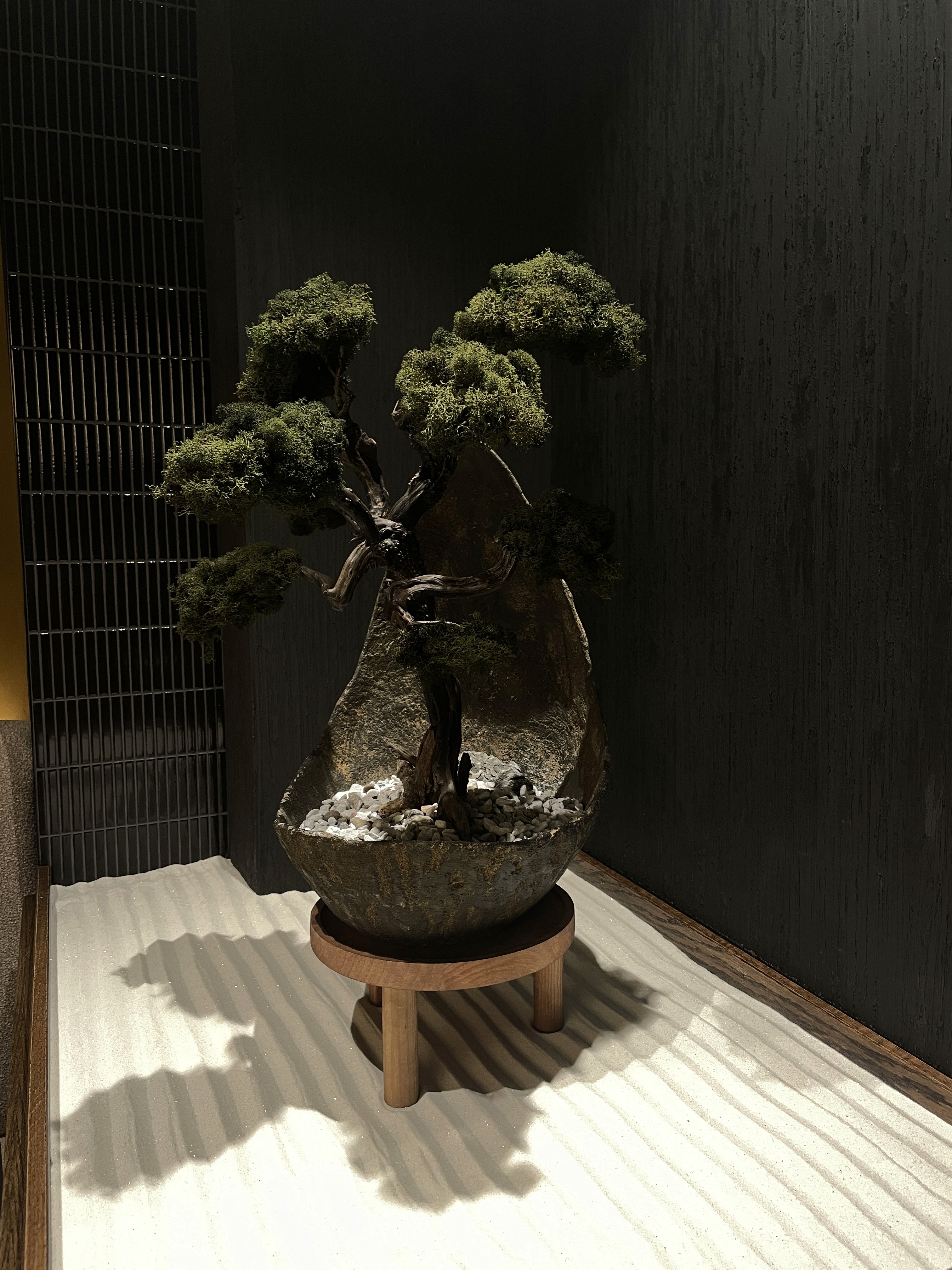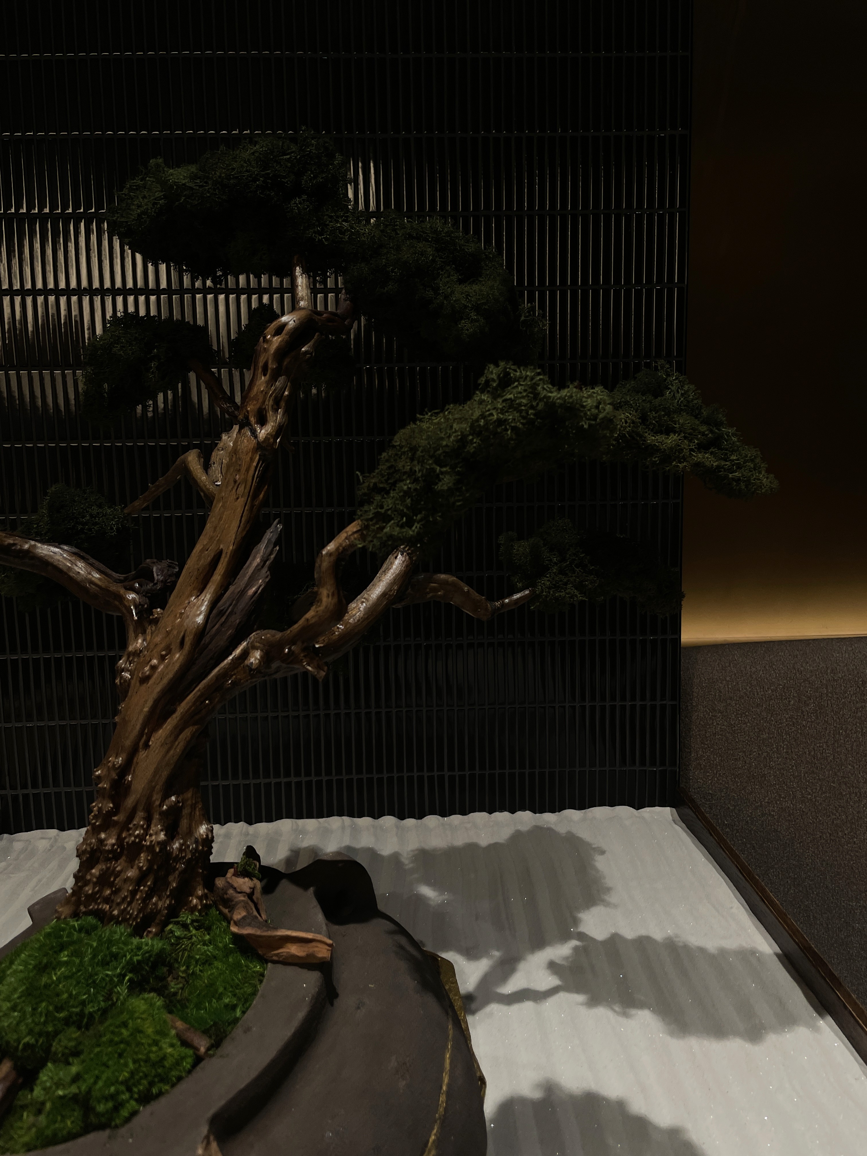 Our role was to deepen that connection through permanent plant installations and ikebana. Zen sand gardens were placed throughout the space to introduce moments of calm and Japanese materiality into an otherwise heavy interior. We chose preserved bonsais over living plants after considering the daily realities of restaurant operations, designing with the staff's process in mind rather than against it. Near the private dining room, a six‑foot encased ikebana display serves as a focal point, breaking up the dominance of screens and offering a preserved moment of compositional stillness.